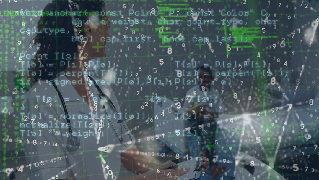 This represents innovative healthcare solutions by blending medical practice with data technology. Ideal for medical technology articles, healthcare blogs, telemedicine services, presentations on AI in medicine, or promotional materials showing alignment of healthcare with modern tech solutions.