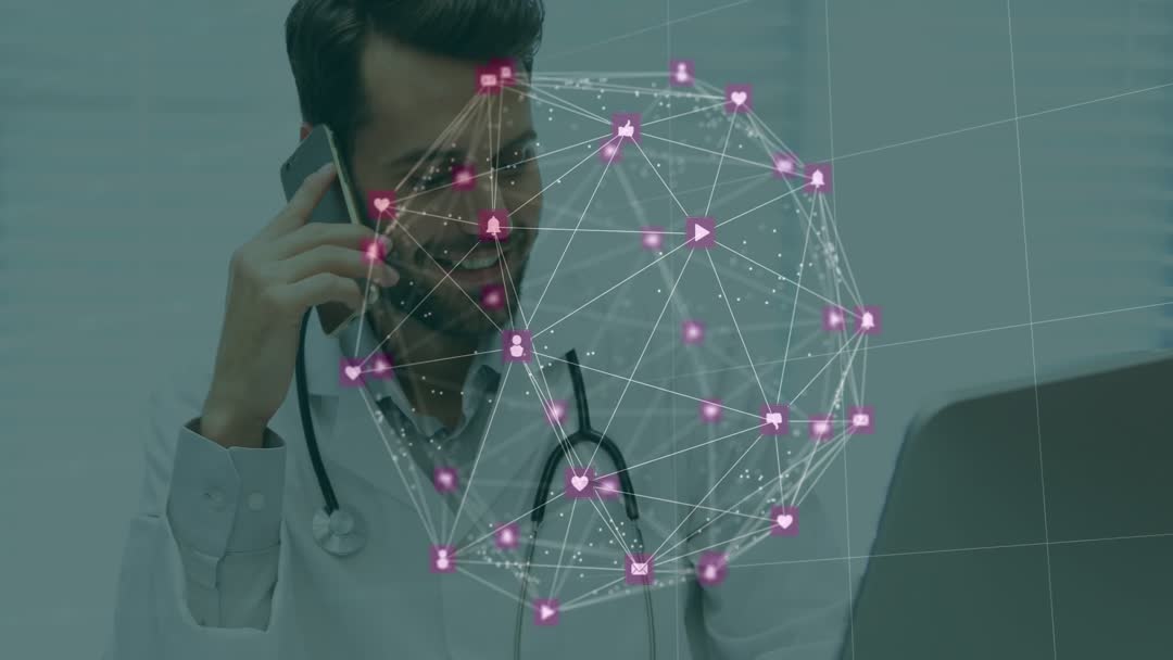 Medical professional communicates while interacting with a digital display of healthcare analytics represented by a rotating network of connected icons. Useful for illustrating advancements in telehealth, digital communication, and innovative healthcare practices, suitable for educational or promotional material focusing on modern healthcare solutions and technologies.