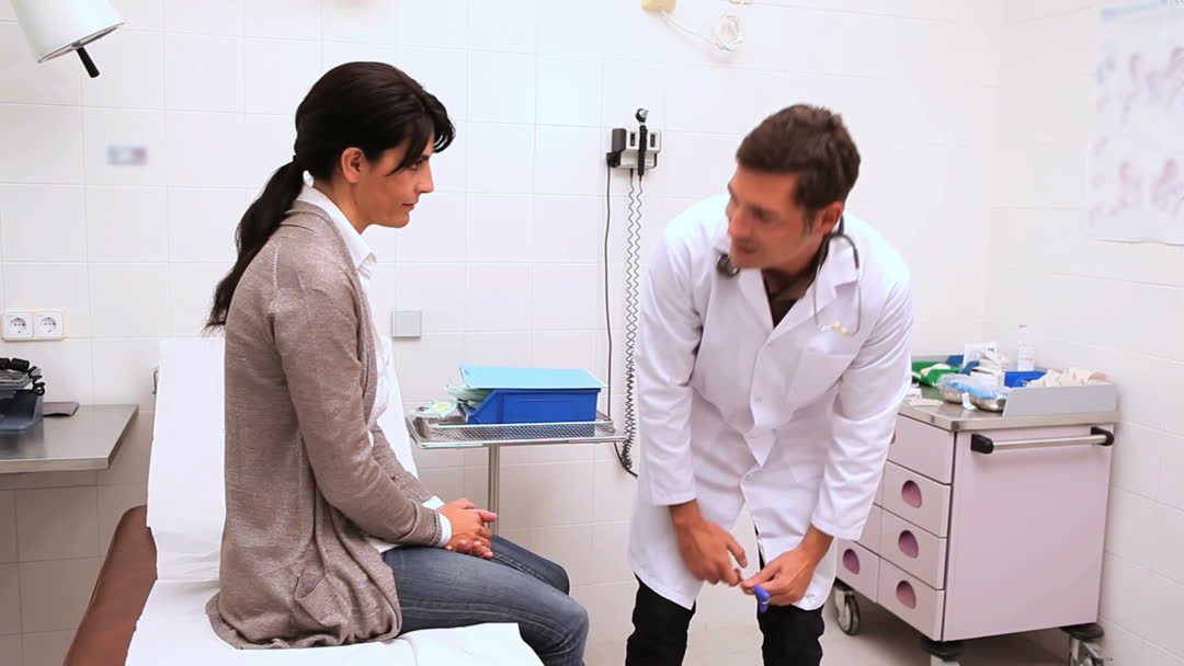 Medical professional evaluates knee reflexes of sitting female patient in a clinical room. Can be used in healthcare advertising, medical website content, educational materials, telemedicine promotion, or wellness brochures highlighting doctor-patient interactions.