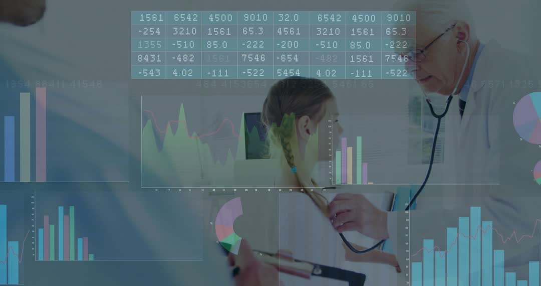 Child sitting on exam table while doctor uses stethoscope in clinical setting, overlay of statistical charts symbolizes monitoring and cutting-edge technology in healthcare. Useful for topics related to modern medical practices, data-driven healthcare decisions, and patient care innovations.