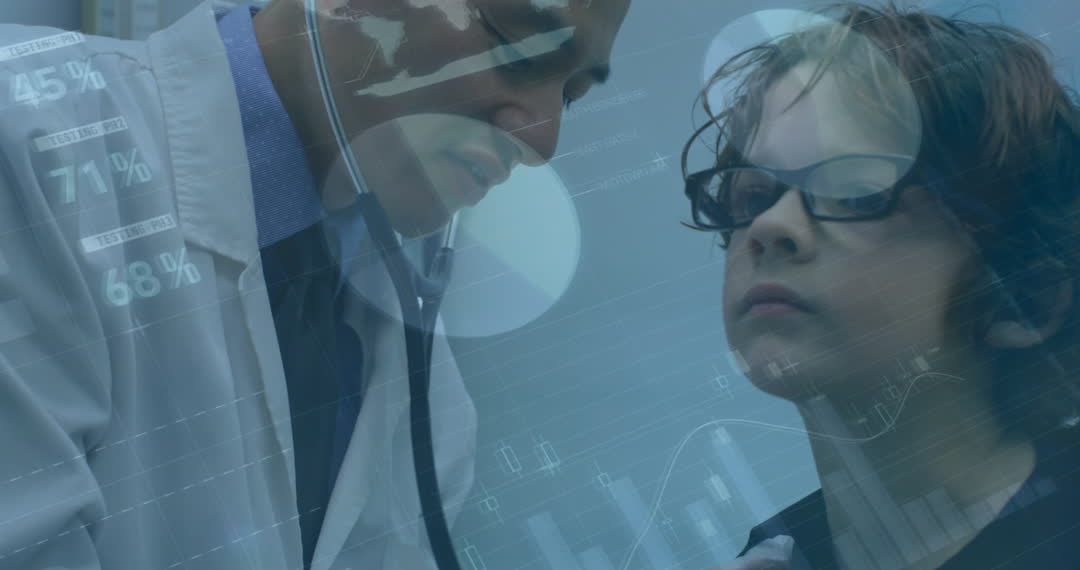 Shows interaction between doctor and child in healthcare setting, enhanced with digital infographic overlay displaying global data and analytics. Highlight how technology influences modern medical practices and diagnostics. Suitable for themes of digital health innovations, child healthcare advancement, technological impact in medicine.