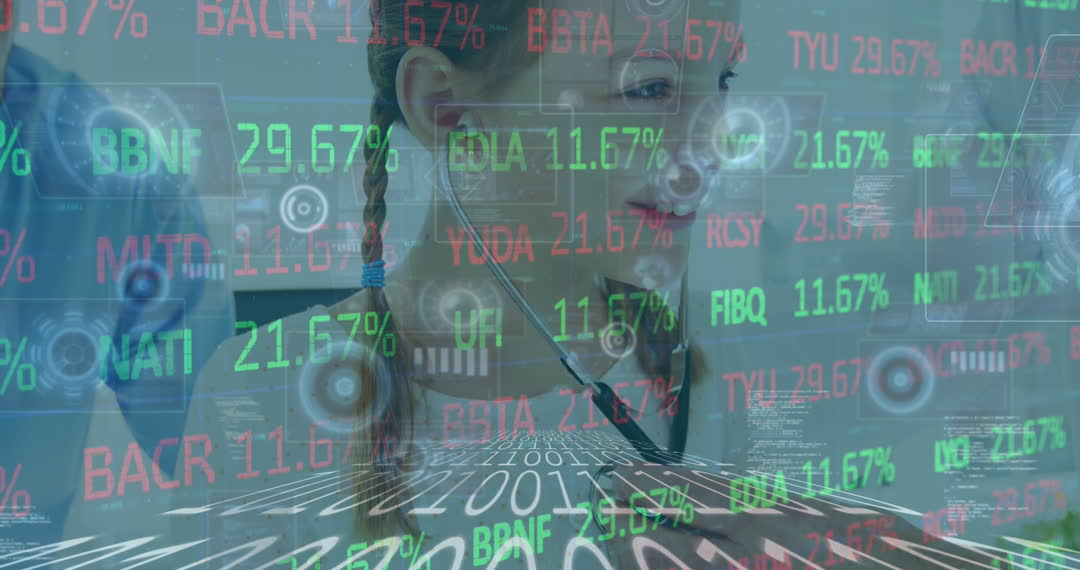 Doctor assessing patient against futuristic digital display showing data processing and stock market figures. Perfect for depicting healthcare technology integration or digital health innovation. Useful for medical articles, healthcare technology presentations, or financial intricacies in healthcare sector insights.