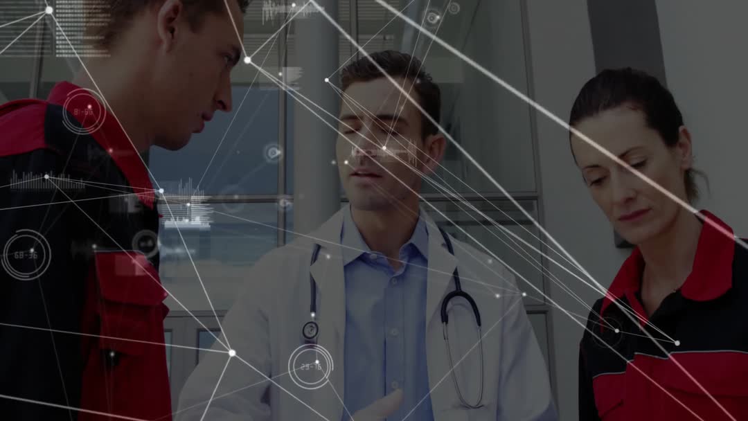 This video captures a medical team's collaborative approach as a doctor explains a procedure to two paramedics within a hospital corridor. The overlay of animated ECG graphs adds a dynamic aspect, symbolizing medical technology and urgency. This can be used in articles related to healthcare teamwork, emergency medical services, or training visuals for medical communication strategies.