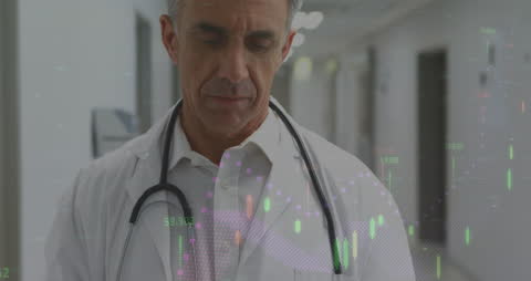 This video depicts a medical professional with a serious expression as stock market data overlays the scene. The combination of healthcare and business symbolizes the intersection between medical practice and financial interests. Appropriate for articles or presentations on healthcare innovation, the growing relationship between healthcare and technology, or discussions around medical investments.