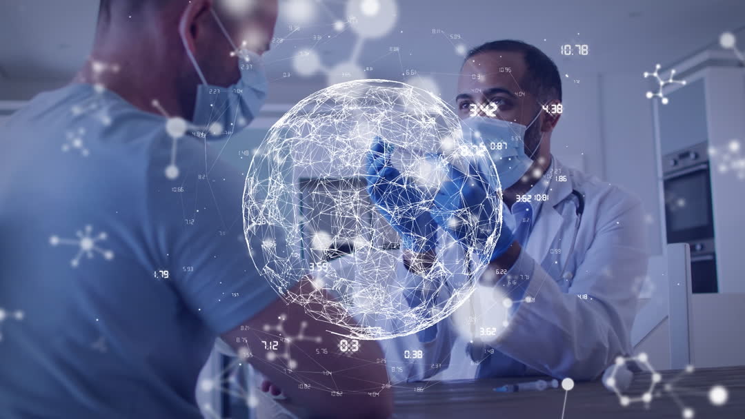 A biracial male doctor and patient engaged in a medical consultation, accented by a virtual network of molecules and a digital globe overlay. The scene conveys the integration of advanced technology in modern healthcare settings, illustrating concepts of virtual healthcare, digital medicine innovation, and global medical communication. Perfect for use in articles, presentations, and marketing on advancing medical technologies and healthcare digital transformation.