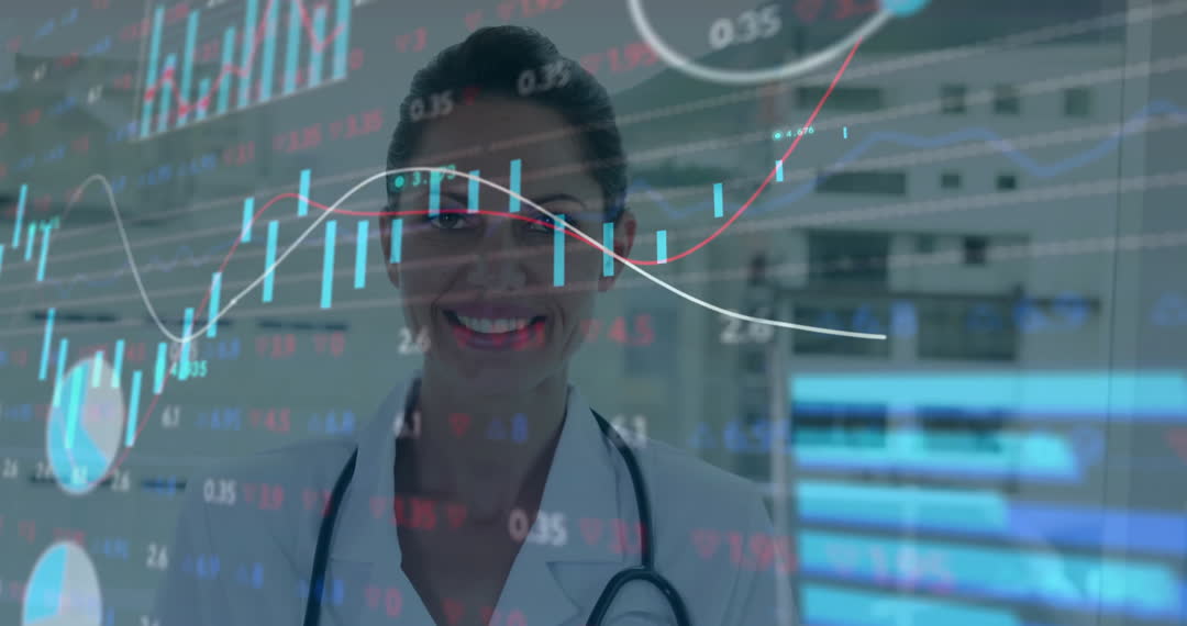 Healthcare professional collaborates with financial data, symbolizing integration and technological advancement in the medical field. Suitable for illustrating healthcare analytics, medical research funding, or the convergence of finance and health sciences.