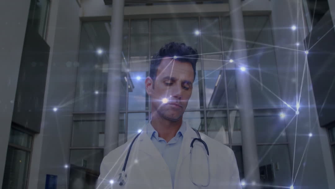 A male doctor in a white coat, wearing a stethoscope, navigates a tablet with a network of connections overlaying, symbolizing the integration of technology in the medical field. This visual can be utilized for illustrating advancements in digital health, smart technology applications in medicine, or showcasing technological evolution in healthcare settings.