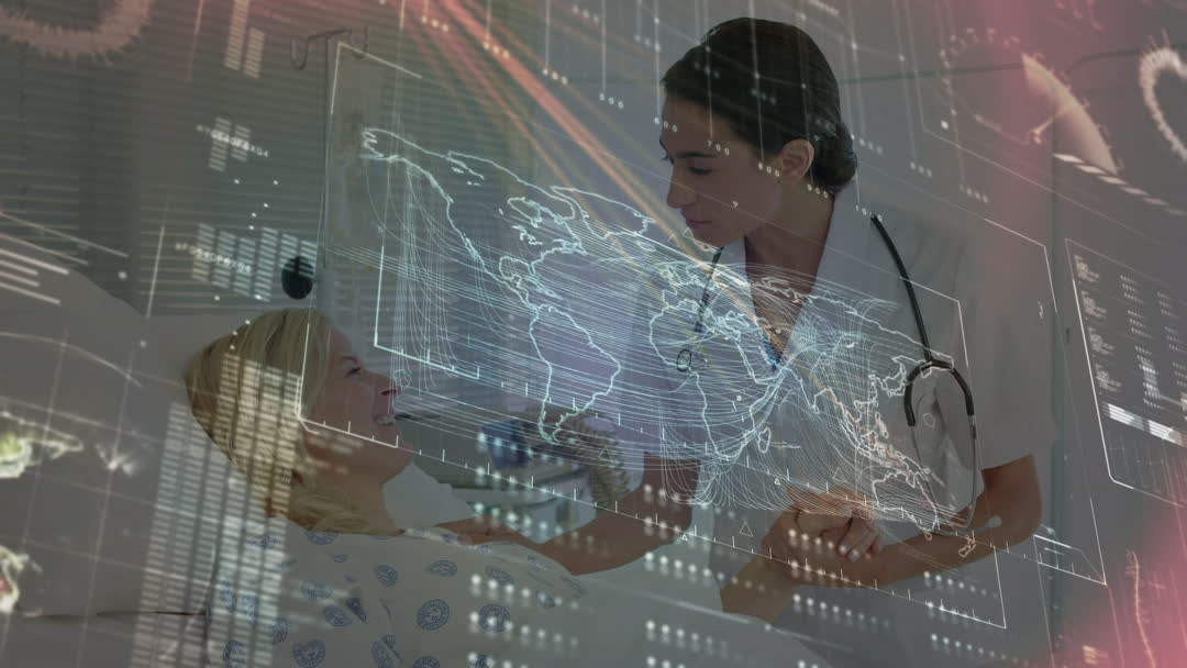 Scene shows a biracial female doctor speaking with a female patient against a backdrop featuring animated digital data and world maps. This visual focus emphasizes the intersection of technology and healthcare, suggesting a forward-thinking medical environment. Useful for illustrating advancements in global medicine, telecommunications in healthcare, or the digitalization of patient care systems.