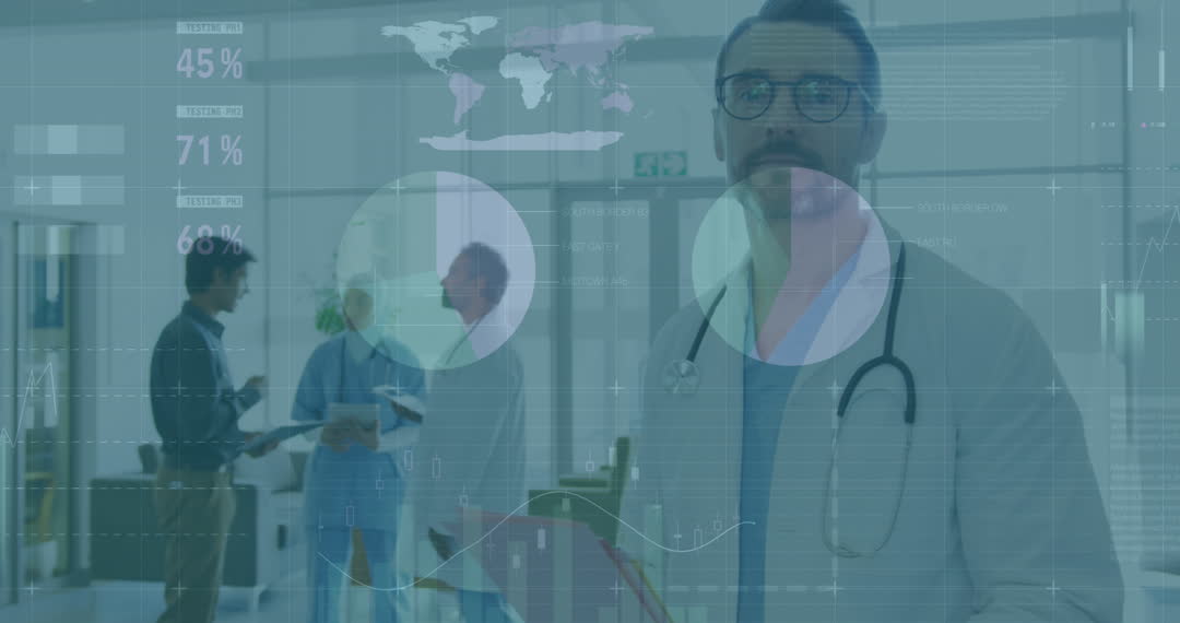 A professional male doctor oversees financial and healthcare data, showcasing modern medical technology. This representation of data-driven healthcare solutions offers a compelling visual for articles on health tech advancements or educational materials about medical informatics and data analysis in healthcare.