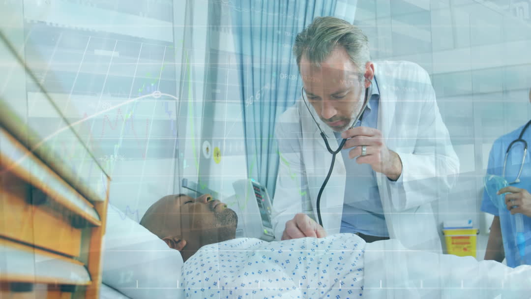 Doctor using stethoscope to check resting patient's condition, emphasized by technology and data analysis graphics symbolizing the integration of healthcare with advanced technology. Suitable for discussions on modern healthcare advancements, data-driven medical strategies, and implications of technology in medical settings, especially during pandemics.