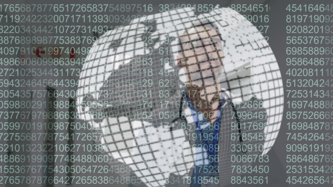 A male doctor walks through a hospital corridor with digital overlays of a spinning globe and binary code, symbolizing the intersection of technology and healthcare. Ideal for themes of medical innovation, digital transformation in healthcare, and global health technology solutions.