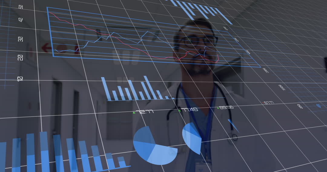Image of a male doctor visualized with superimposed financial charts and graphs, reflecting a nexus between economics and healthcare. Ideal for illustrating concepts of global healthcare financing, the intersection of tech in medicine, or economic analysis in medical fields. Suitable for use in articles, reports, or presentations exploring innovative healthcare strategies and financial planning in the medical sector.