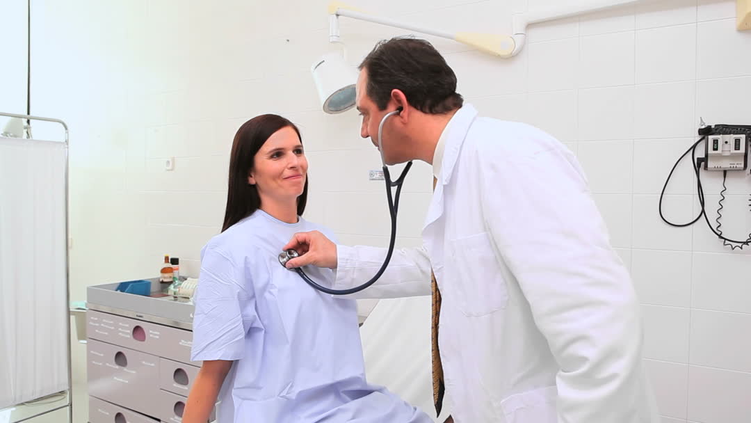 This video shows a healthcare professional using a stethoscope to auscultate a smiling patient in an examination room, emphasizing a supportive doctor-patient relationship. It can be used to promote medical services, educational materials on patient care, and advertisements for healthcare facilities.