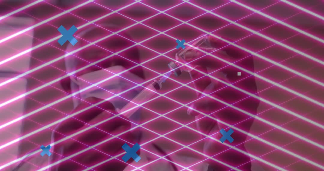 Medical professional wearing mask preparing syringe, overlaid with dynamic digital elements such as a pink grid and glowing medical icons. The digital enhancements create a futuristic health technology vibe, highlighting innovation and precision. Ideal for illustrating topics related to modern healthcare tech, innovation in medical practices, and biotech advancements.