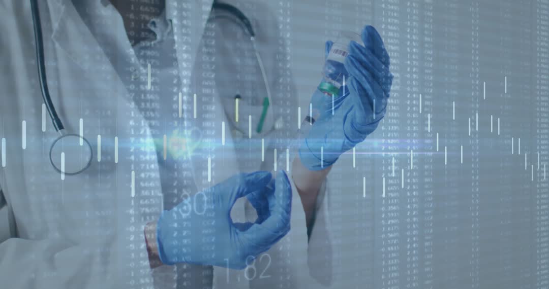 A doctor wearing a white coat is drawing medication from a labeled vial into a syringe, wearing blue gloves. Behind the doctor, data and animated bars suggest a focus on advanced technology and precision in healthcare. This can illustrate concepts in medical research, technology-driven health innovations, or precision dosing, suitable for health publications, educational materials, and technology showcases.