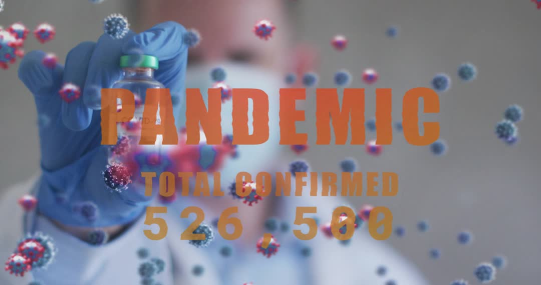 Video showing gloved doctor presenting vaccine vial toward camera while pandemic confirmed counter rising and 3D virus particles floating across frame. Medical professional wearing lab coat, nitrile gloves, surgical mask, stethoscope visible in background, creating clinical and urgent tone. Visual combining close-up clinical footage, motion graphics, and numerical data overlay for dramatic storytelling. Use for breaking news openers, documentary segments, public health announcements, vaccine awareness campaigns, epidemiology reports, medical training modules, and website hero headers. Suitable for broadcast headlines, social media clips, educational presentations, corporate health briefings, and patient information materials. Color palette and shallow depth of field reinforcing professional credibility and emotional impact; duration working well as short intro or looping background for multimedia projects.