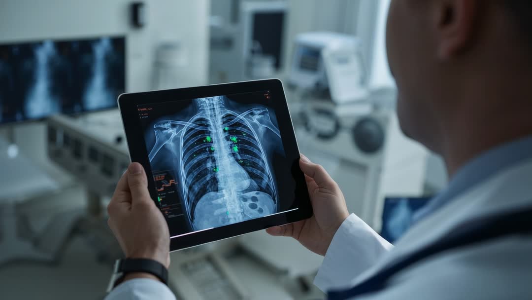 - Doctor reviewing digital chest X-ray with AI markers on tablet in hospital diagnostics
