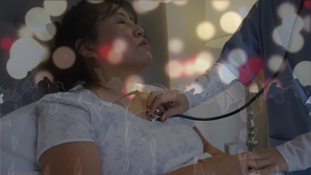 Image shows a doctor using a stethoscope to examine a female patient, with an overlay of light spots creating a sense of digital or conceptual innovation in medical care. Useful for articles or presentations on modern healthcare technologies, doctor-patient interactions, or advancements in medical diagnostics.