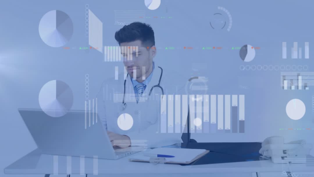 Doctor Typing on Laptop with Animated Medical Analytics Video