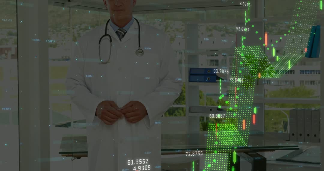 Depicts healthcare professional engaging with digital candlestick charts and data waves. Represents integration of technology in medicine. Useful for articles or presentations on medical innovation, digital advancement in healthcare, or data-driven medicine.