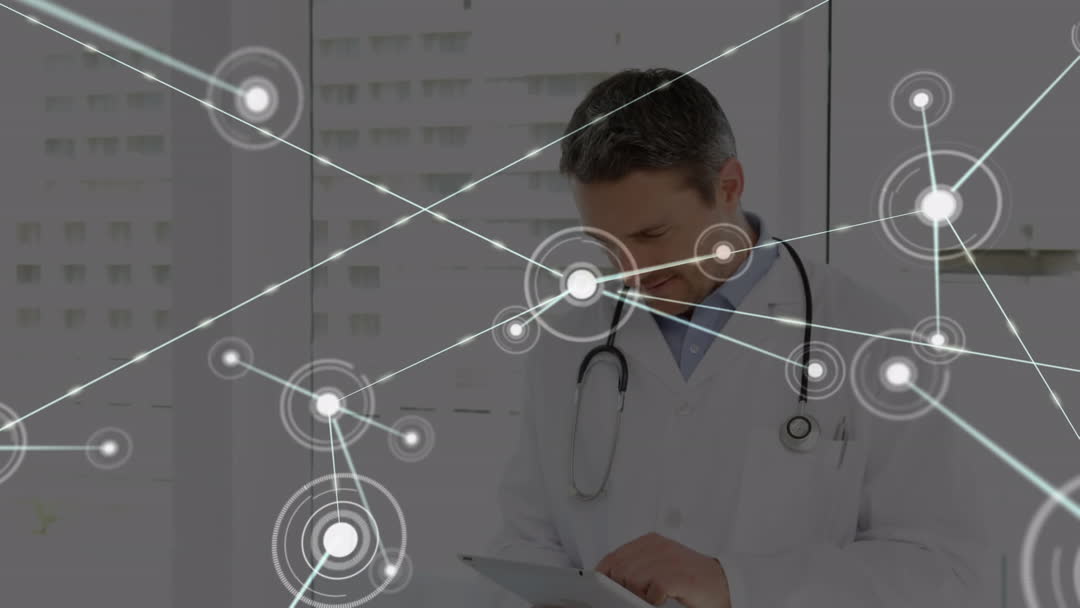 Depicts a male doctor engaging with a digital tablet in a hospital environment overlaid with an illustration of interconnected dots, symbolizing a network interface and modern connectivity in healthcare. Suitable for themes related to advanced medical technology, digital healthcare transformation, and the integration of communication networks in hospital settings.