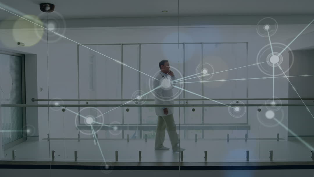 The video depicts a biracial male doctor walking in a modern hospital with an animated overlay of network connections, symbolizing advancements in medical technology and connectivity. He is seen contemplating while surrounded by gauzy depictions of interconnected network nodes suggesting integration or data flow, portraying both movement and thought. Ideal for illustrating articles related to healthcare innovation, technological advancement in medicine, or global healthcare systems. It emphasizes themes like modern medical protocols, advancements in telemedicine, and integrated healthcare systems.