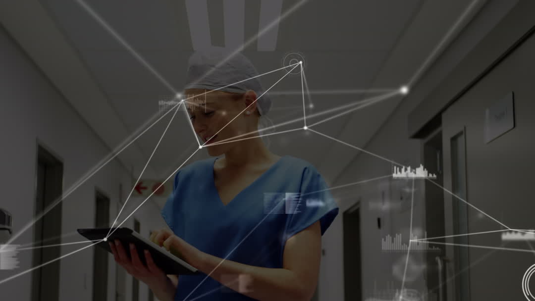 Female doctor engages with digital tablet surrounded by data connection lines, representing technological advancements and digital networking in healthcare. Useful for illustrating modern medical technology, secure data handling, and the integration of digital tools in healthcare environments.