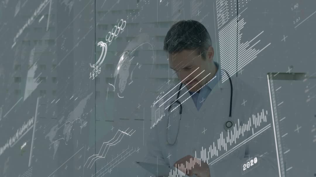 Doctor reviews medical data using tablet with digital charts and statistics overlaying scene. Represents healthcare innovation and use of technology for data analysis. Great for advertising medical technology solutions, illustrating concepts of modern healthcare, or analytics in medical fields.