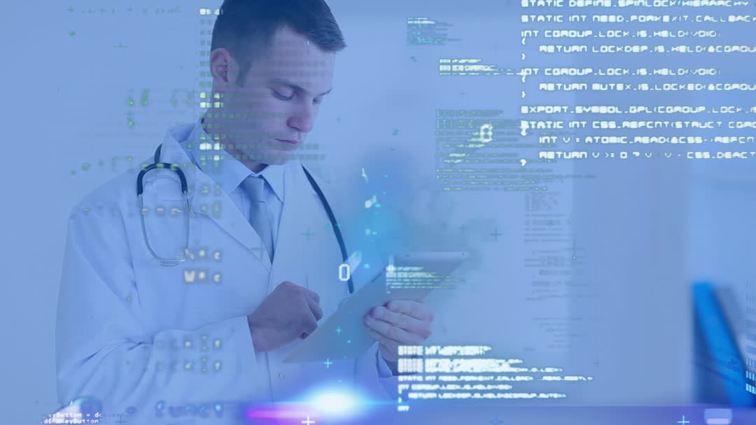 A young doctor is interacting with a digital tablet in a medical office setting. Surrounding him are visual effects of code and data, marking the integration of advanced digital interfaces with healthcare technology. This videory highlights innovation in global medicine, portraying a modern doctor leveraging cutting-edge technology. Useful for concepts related to healthcare innovation, medical research, or promotional materials for medical software.