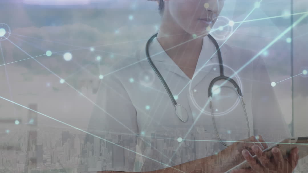 A female doctor engaged with a tablet device is visualized through a digital network overlay, symbolizing modern healthcare and technological advancement. This composite is ideal for resources focusing on innovation in medical fields, healthcare technology, connectivity in health services, and digital communication themes.