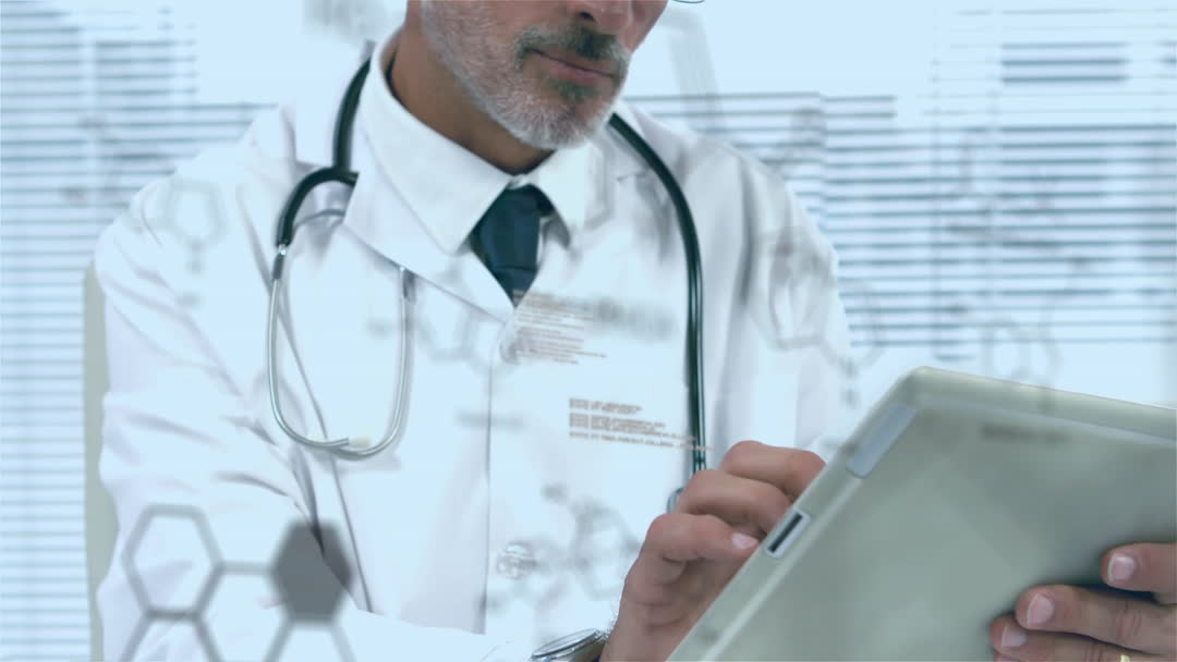 The video depicts a Caucasian male doctor engaging with digital data on a tablet, representing the integration of technology and medicine. Hexagonal graphic overlays suggest the influence of scientific research and data analytics in modern healthcare. This would be useful in contexts related to modern medicine, healthcare innovation, digital tools in medical research, and promotion of medical technology.