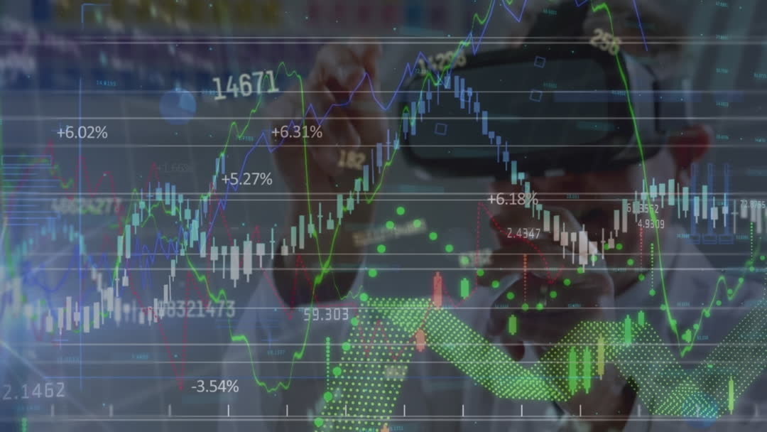 The composition integrates a medical professional, utilizing virtual reality technology within a healthcare context. The overlay of financial data suggests themes of investment, economic analysis in healthcare, or technological advancement. This can be used in articles highlighting innovative technologies in the medical field, presentations on market trends in healthcare investment, or educational materials discussing the intersection of technology and medicine.