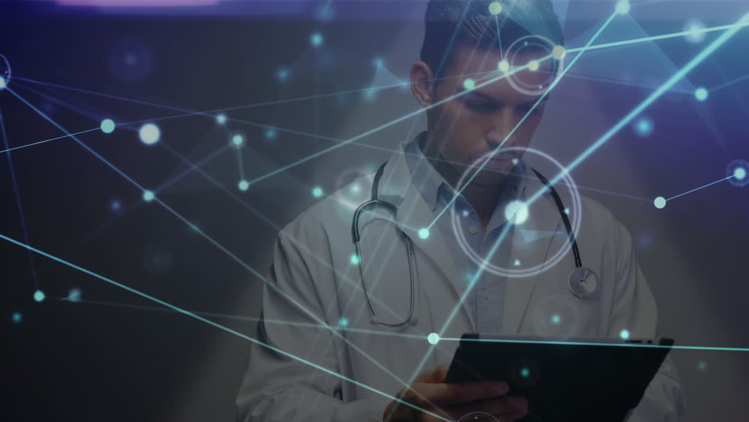 Depicting a modern healthcare professional integrating technology into practice, showing a doctor in a lab coat using a digital tablet with abstract glowing network graphics indicating connections and data flow, ideal for use in medical technology articles, healthcare innovation features, or futuristic medical tools advertisements.