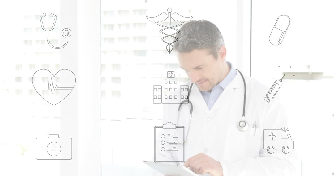 Doctor Utilizing Tablet with Animated Healthcare Icons Video