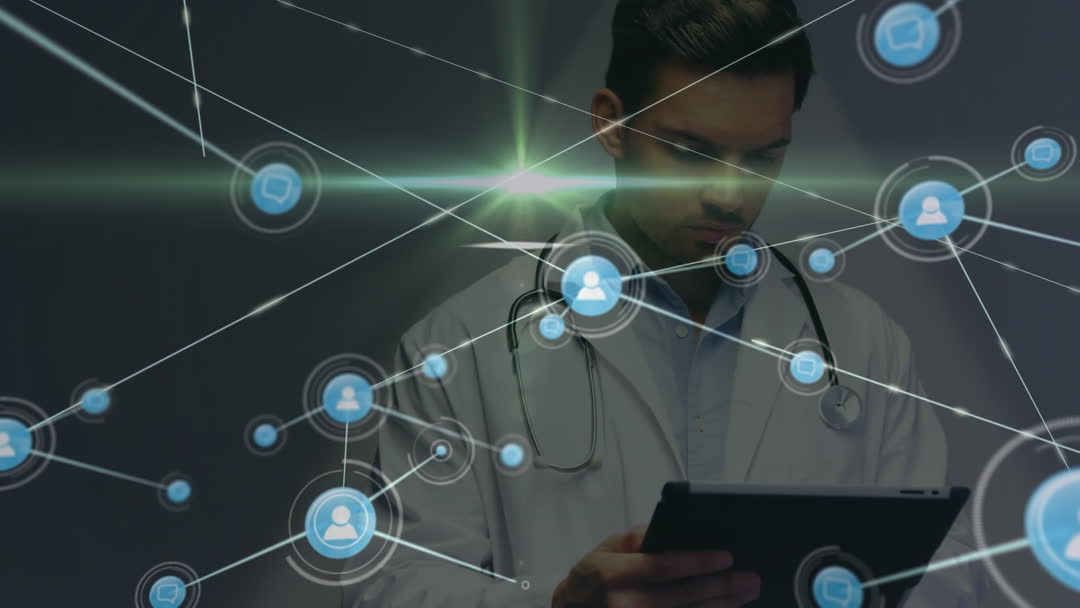 The video depicts a doctor holding a tablet, surrounded by digital network icons representing connectivity and data exchange in healthcare. This visual conveys concepts of modern medical technology, digital healthcare solutions, and innovative patient management. Ideal for illustrating themes in healthcare technology, data analytics in medicine, or telemedicine services in blogs, articles, or presentations.