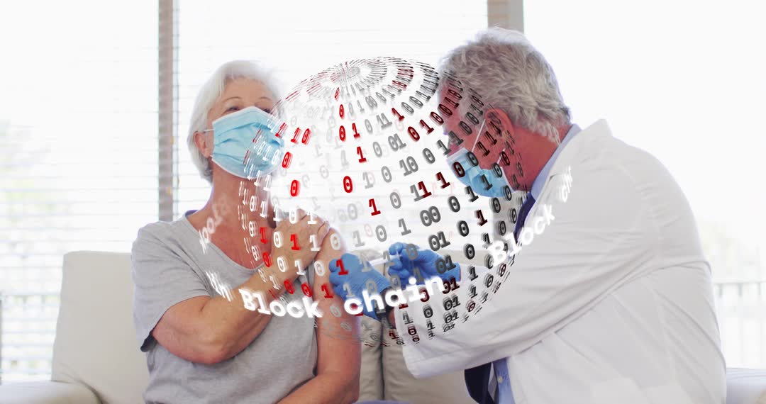 Elderly patient receiving a vaccination from a medical professional while a blockchain data representation visualizes floating beside them, symbolizing integration of secure data technology in healthcare. Ideal for illustrating advancements in medical security or health tech solutions.