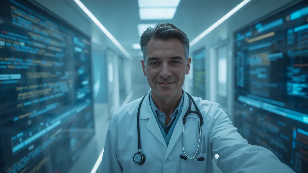 AI Generated Image. Video clip showing middle-aged male doctor walking hospital corridor while reviewing digital patient data on large wall monitors. Doctor wearing lab coat and stethoscope, smiling while approaching camera. Ambient blue lighting and futuristic interface panels suggesting high-tech clinical environment. Camera perspective creating first-person engagement ideal for telemedicine and virtual consult demos. Footage working well for healthcare marketing, hospital website hero clips, electronic health records demos, medical technology presentations, corporate healthcare reports, training modules, and patient communication videos. Color grading and shallow depth of field emphasizing professional focus and trustworthy bedside manner. Duration suitable for looping as background or for use as B-roll in promotional and educational sequences.