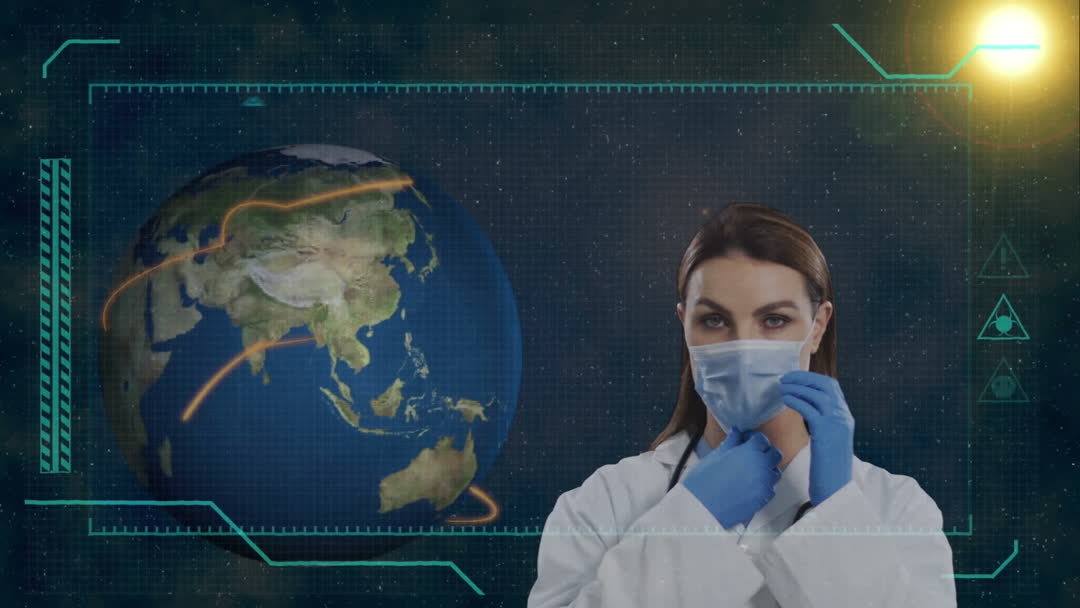 This striking visualization shows a medical professional adjusting a face mask while surrounded by animated digital elements, including a rotating globe. Perfect for use in articles or presentations focused on global healthcare, technological advancements in medicine, or future predictions in pandemics and public health sectors.