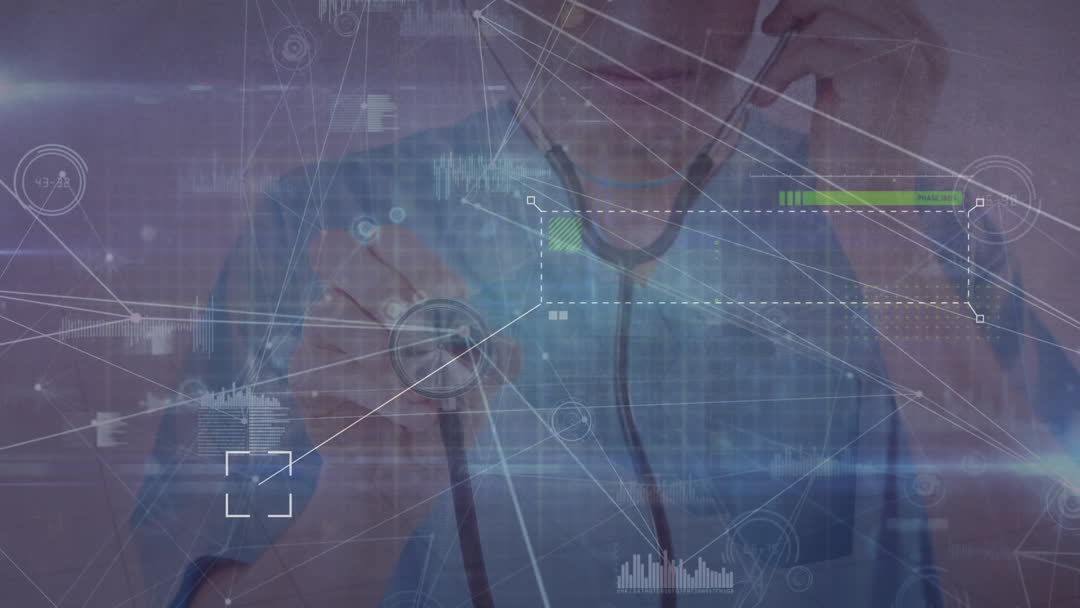 Concept of a female doctor surrounded by digital network graphics, representing advanced healthcare technologies. Ideal for use in articles about innovations in medical technology, health IT, and future of healthcare solutions.