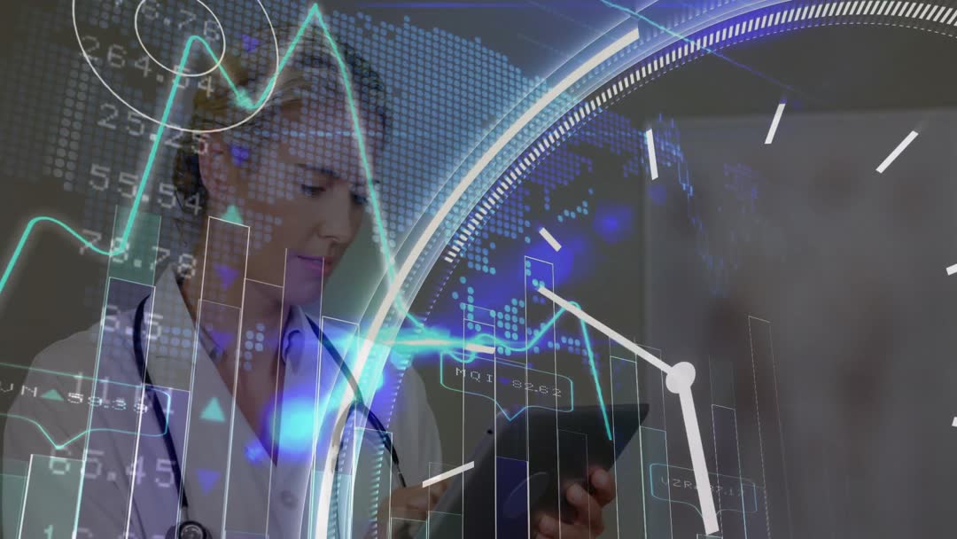 Medical professional using advanced technology, showing integration of data analytics in healthcare. Represents innovation and efficiency in patient care. Useful for topics on healthcare technology advancements and digital medical solutions.