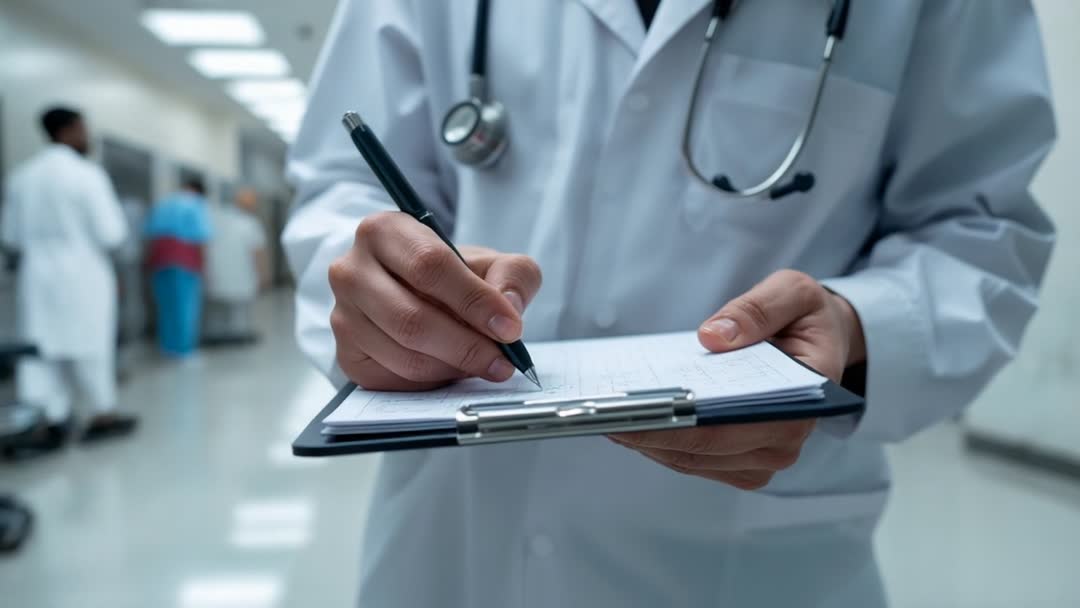 AI Generated Video. Clip showing doctor writing patient notes on clipboard while standing in busy hospital corridor. Hands and clipboard in sharp focus, background medical staff blurred for depth. White coat and stethoscope conveying clinical authority and professionalism. Close-up framing emphasizing documentation, charting, and patient record keeping. Usage ideas: - Illustrating documentation processes, compliance training, and clinical workflow presentations - Supporting training videos and e-learning modules for clinicians on charting best practices - Enhancing healthcare marketing, hospital websites, recruitment campaigns, and career pages - Complementing editorial content on patient safety, electronic medical records, and malpractice prevention - Providing B-roll for telemedicine demos, medical technology showcases, clinical research, and hospital operations Technical notes: - Horizontal 16:9 framing suitable for video projects, website banners, and social media clips - Neutral color palette and soft corridor lighting enabling easy color grading and overlay of text or graphics - Close-up composition useful for focusing attention on documentation, signature, or form fields
