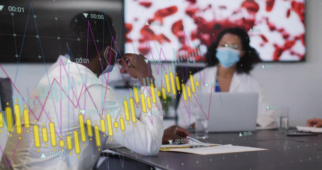 Medical professionals in a collaborative meeting are seen analyzing scientific data with digital graph overlays. Displaying videos of blood cells in the background contributes to a scientific and innovative atmosphere. This includes modern gadgets for analysis, signifying the integration of technology and healthcare. The scene is ideal for visualizing updated medical innovations and affinity spaces of professional healthcare workflows. Perfect for showcasing advancements in medical diagnostics, team collaborations, and the role of data analysis in healthcare.