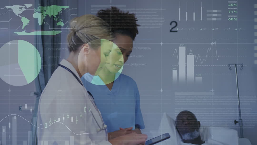 Two female medical professionals, a doctor and a healthcare worker, engage in a detailed discussion while looking at interactive digital data displays. These overlays show diverse healthcare-related charts and graphs, indicating advanced technology use in medical diagnosis and patient care. This concept is ideal for promoting modern technology in healthcare, the dynamics of medical teamwork, and innovation-focused medical services.