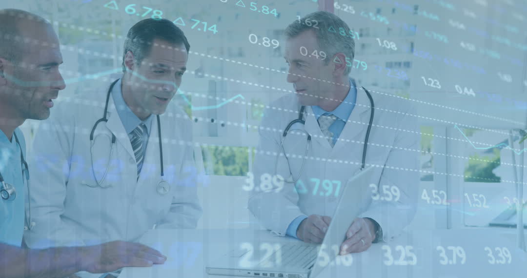 Healthcare professionals in discussion with financial data overlay representing the intersection of medicine and technology. Useful for illustrating themes in medical analytics, healthcare finance, and data-driven healthcare innovation.