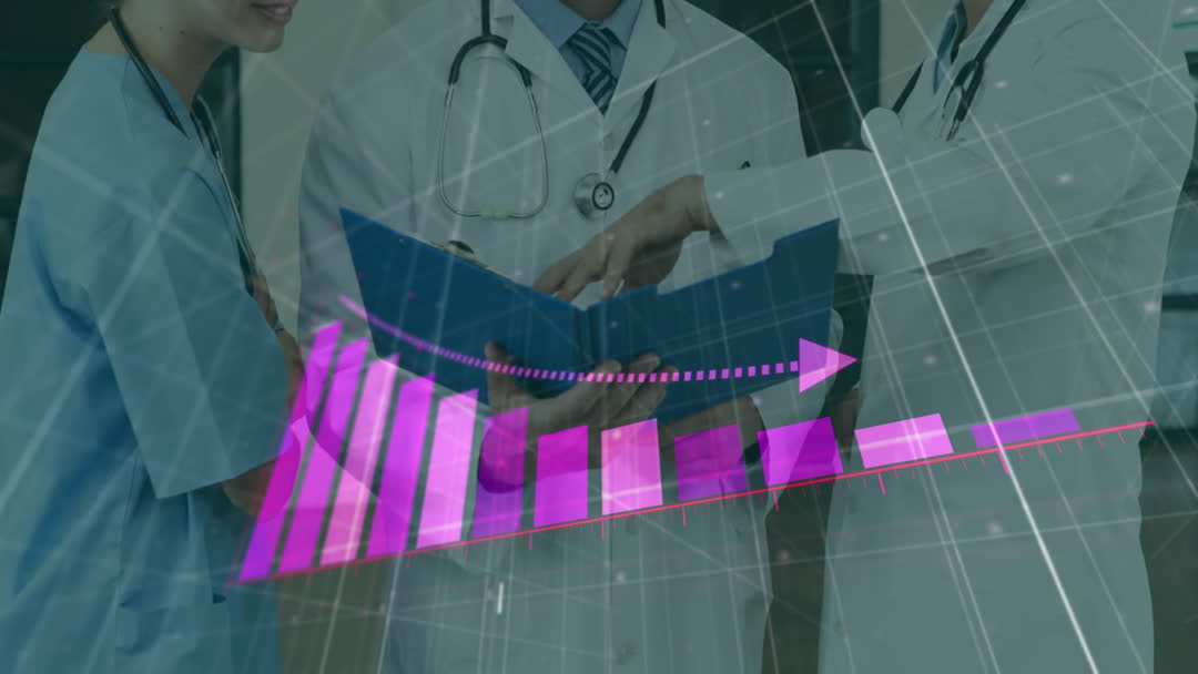 Medical professionals are seen discussing financial and statistical data, signified by a digital bar graph overlay. This video captures collaboration in the medical field, blending healthcare with data-driven research. Ideal for illustrating articles on medical economics, research funding, hospital administration, or healthcare analytics.
