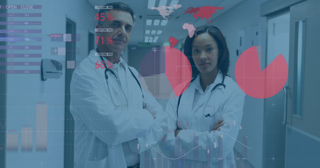 Image features male and female doctors in hospital corridor with financial graphs and charts overlayed. This visual fusion of healthcare and data suggests discussions on the intersection of economics and medicine. Use this for articles or presentations on healthcare finance, global economic health impacts, or innovations in medical data analysis.