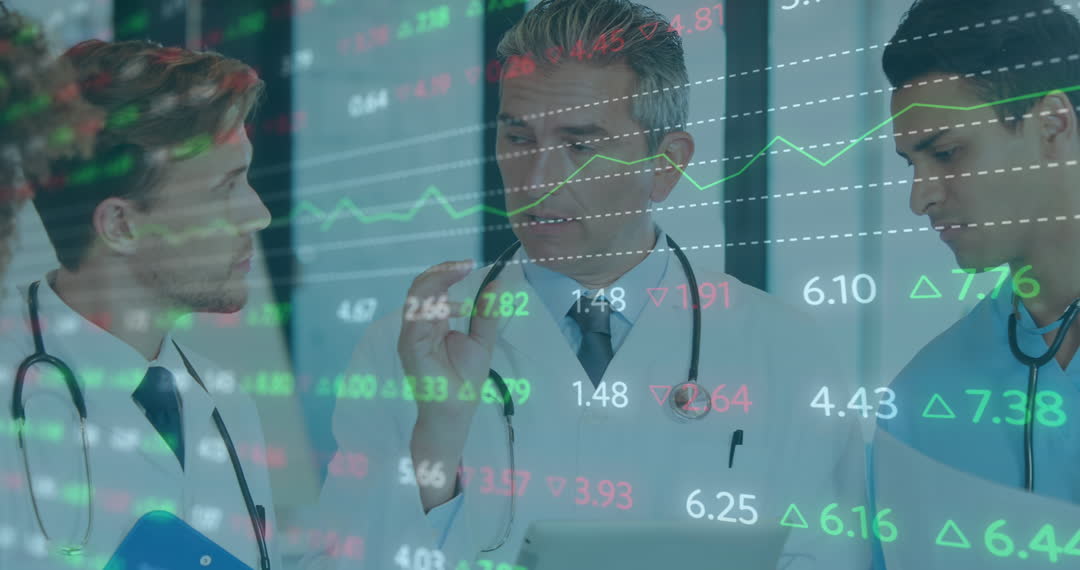 Doctors engaging in deep discussion surrounded by stock market financial data overlay, illustrating the intersection of healthcare and financial analysis for strategic planning. Use this concept to highlight healthcare trend analysis, financial strategy in medicine, economic conditions affecting healthcare industries, or discussion of innovative medical subsidiary approaches.