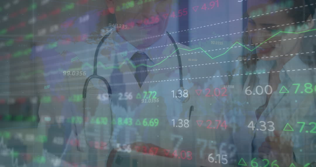 Doctors examining financial data overlays on stock market graph. Reflects interdisciplinary approach in combining healthcare insights with economic analysis. Suitable for use in articles about finance's impact on healthcare or business strategies integrating health expertise.