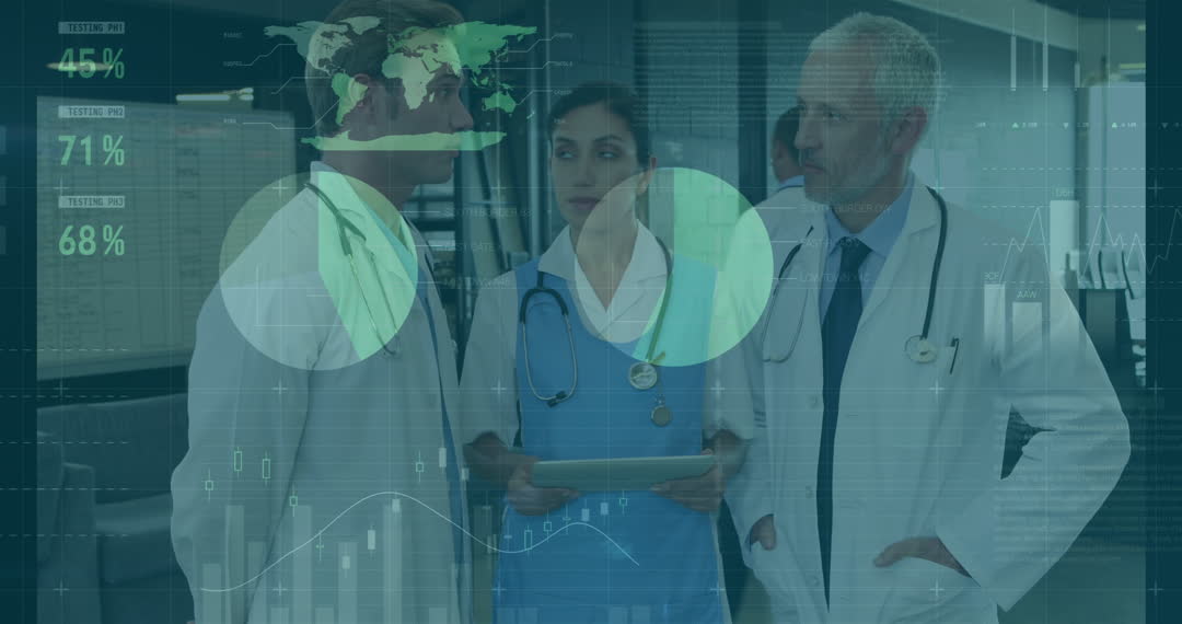 Three doctors, representing a diverse team, are seen in conversation, surrounded by animated data and graphs. Medical professionals wear white coats and stethoscopes while engaging with advanced technology related to health analytics. This video captures the intersection of healthcare and technology, showcasing the importance of data-driven decisions in modern medicine. Ideal for use in publications about medical technology advancements, healthcare industry trends, and the integration of digital tools in patient care.