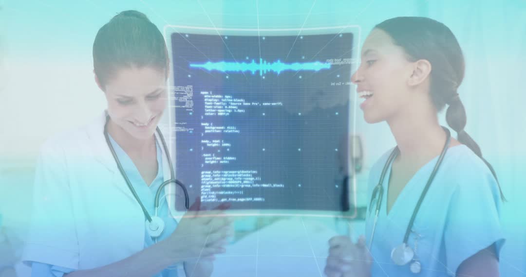 Two doctors use advanced technology, analyzing holographic data displays featuring coding graphs and waveforms for precise patient diagnosis. This emphasizes collaboration and innovation in modern healthcare settings. Suitable for depicting future medical advancements, technology integration, or evolving diagnostic solutions.